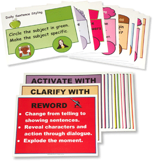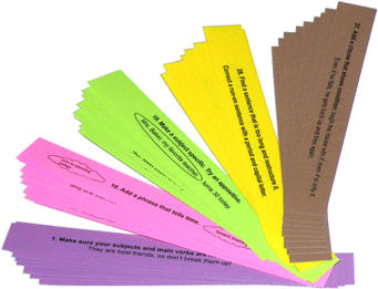 A set of large write-on, wipe-off sentence and punctuation shapes for explicit instruction and modeling are included in each kit. Magnets on the back of the 36 sentence shapes make them easy to display on the classroom white board for teacher and student sentence building and modeling. Students also hold the shapes for interactive learning and speaking/listening skill practice.
