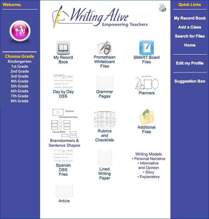 | When your school purchases the initial Essential or Deluxe Curriculum Kits and professional development package, you also receive full use of the online resources for the first three years. To use the Online Resources 1. Register (follow the prompted directions) 2. Enter your Grade Level (pull down menu K, 1, 2, 3, 4, 5, 6, 7, 8) You will be taken to a page that gives you a smorgasbord of choices. This sample page is from the Grade 2 landing page. |